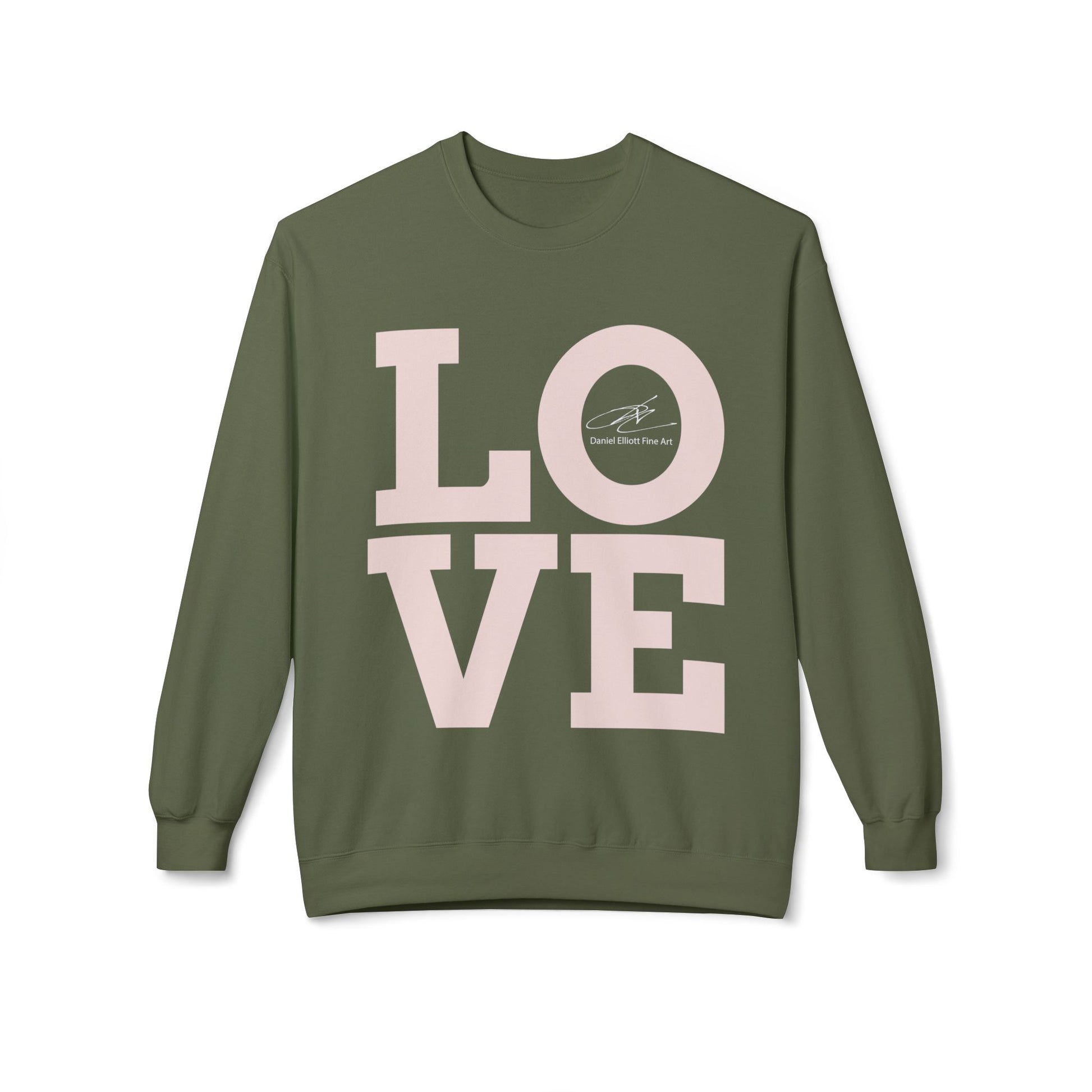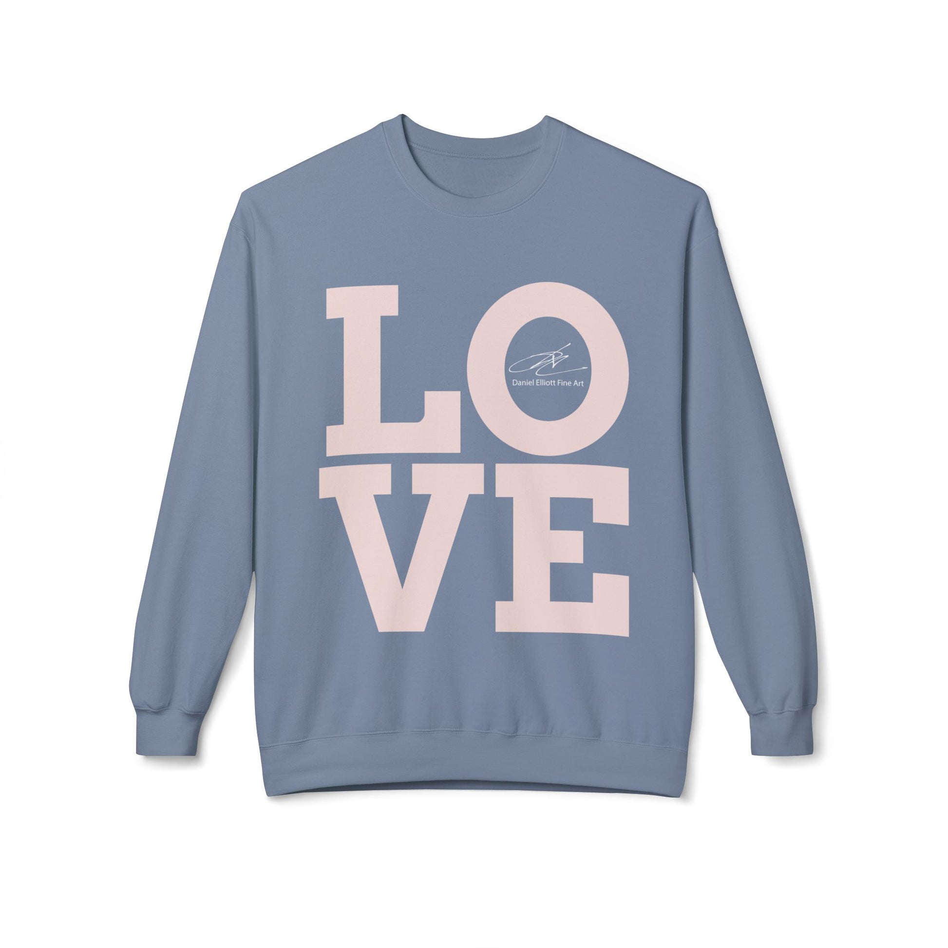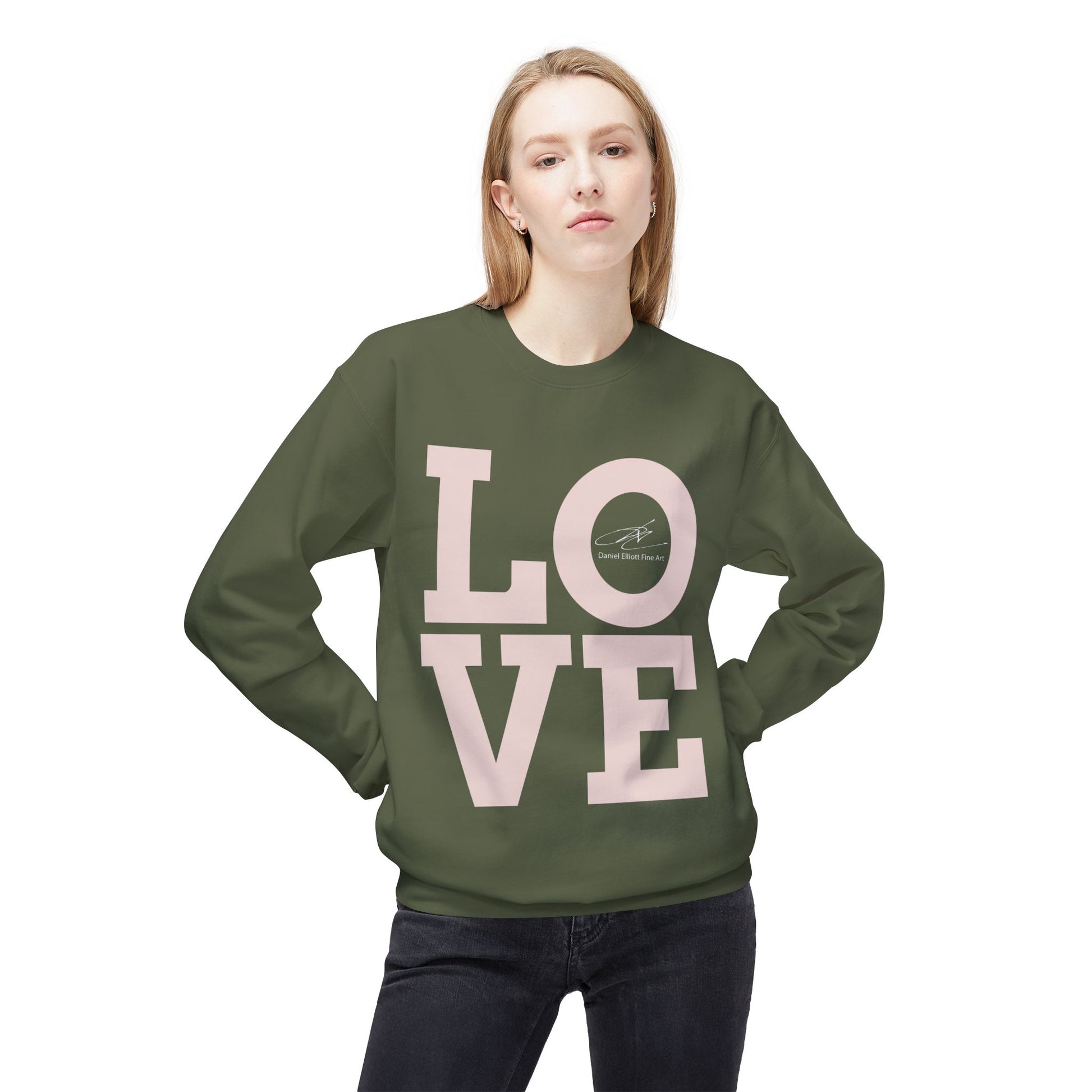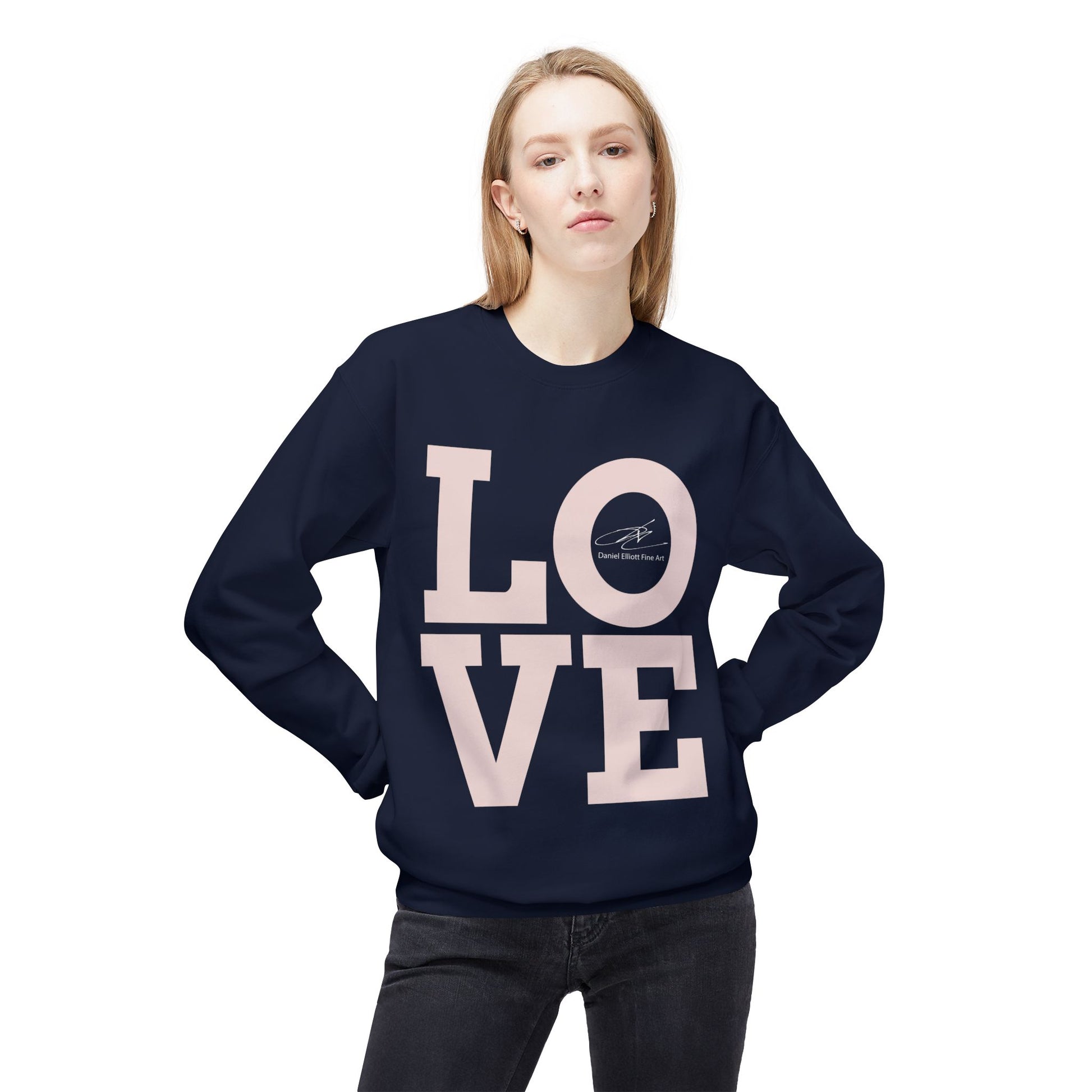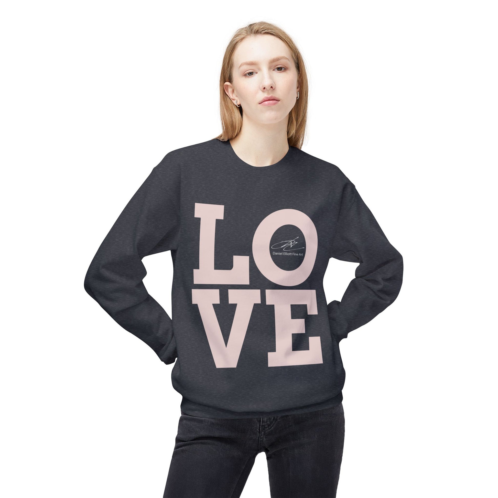 Soft, slightly oversized warmth with a bold, modern message. This midweight crew features blocky, stacked LOVE lettering across the chest in a soft blush hue that pops against the black fabric. The dropped shoulders and classic fit create a relaxed silhouette you can toss on for cool evenings, morning coffee runs, or cozy nights in. The fabric’s substantial weight and brushed interior hold shape and warmth while the ribbed cuffs and hem with spandex keep the fit neat. Wear it layered over a tee or with leggings and boots — it brings a quiet, confident vibe wherever you go.